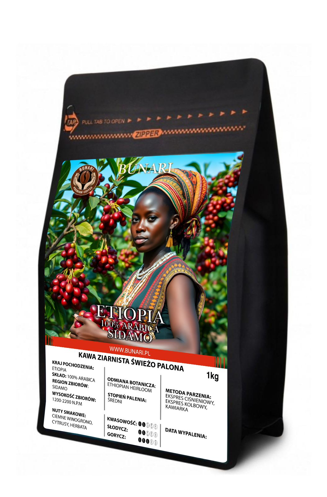Świeżo palona 100% Arabika pochodząca z Etiopii, z cenionego regionu Sidamo, uznawanego za kolebkę kawy najwyższej jakości. Ziarna odmiany Ethiopian Heirloom dojrzewają na wysokości 1800–2200 m n.p.m., co nadaje kawie wyrazisty i wyjątkowo aromatyczny charakter. Profil smakowy łączy nuty ciemnych winogron i cytrusów z delikatnym, herbacianym akcentem. Średni stopień palenia podkreśla naturalną słodycz, przyjemną kwasowość oraz subtelną gorycz. Kawa wyróżnia się harmonijną lekkością i długim, czystym finiszem. Doskonale sprawdza się w ekspresach ciśnieniowych, ekspresów kolbowych oraz kawiarce, oferując zbalansowany i elegancki napar.